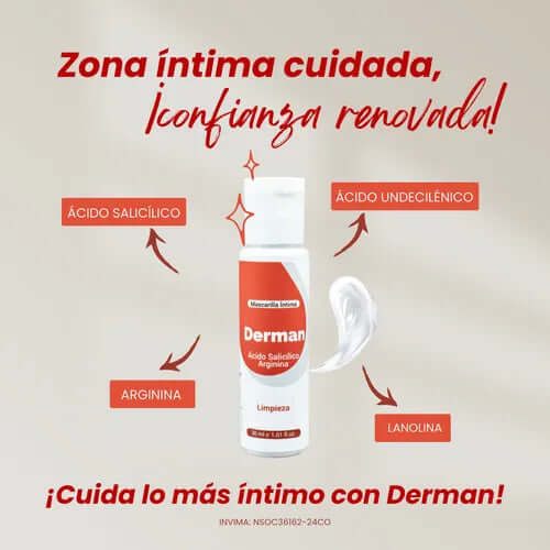 Derman es una crema hidratante para la zona íntima, formulada con activos dermatológicos como ácido undecilénico, arginina, ácido salicílico y lanolina. Hidrata, suaviza y protege la piel vulvar/perineal.
